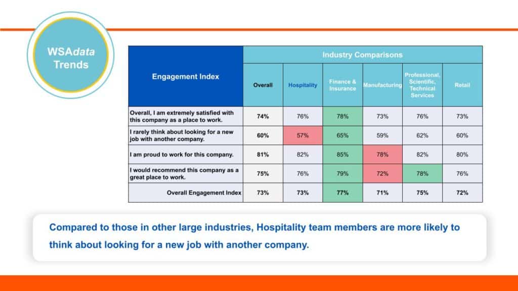 Quantifying engagement’s impact on business performance is essential for making a compelling case for continued investment in employee experience initiatives. According to WSA’s proprietary database, hospitality organizations with higher engagement scores consistently outperform their peers on key business outcomes such as guest satisfaction and revenue.
