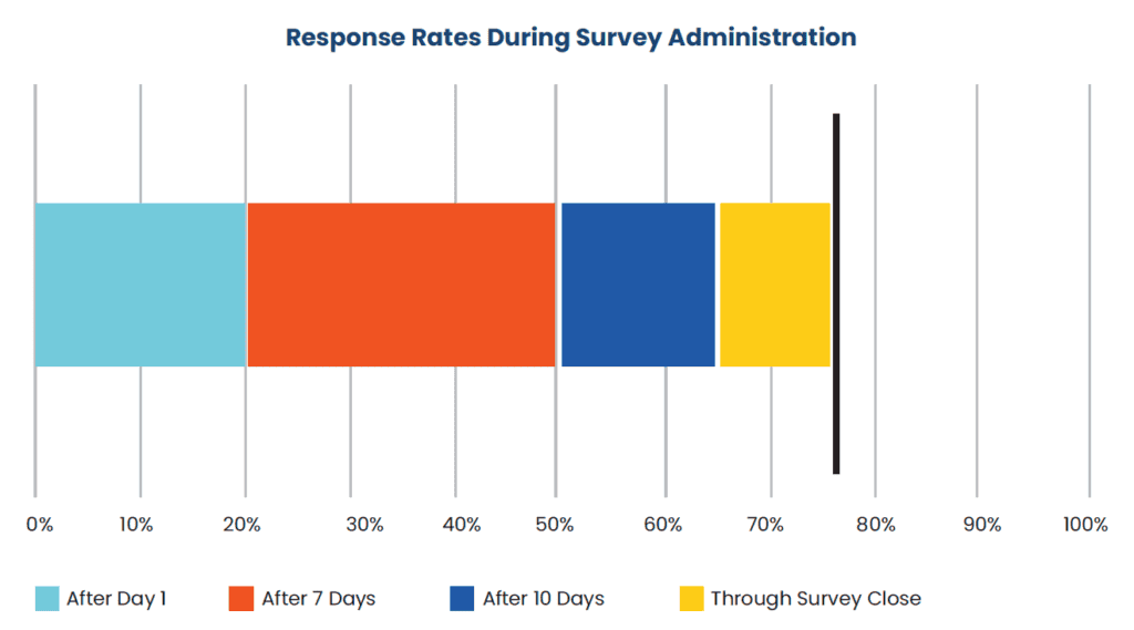 Another factor that can influence response rates is trust within an organization. If employees do not feel a high degree of trust that their opinions will drive change or that their responses will remain confidential, they are less likely to take the survey. This can become particularly true if employees have not seen action taken based on previous surveys. It is critical to effectively communicate the purpose and process of the survey, as well as reinforce prior survey action based on employee feedback. It is important to note that the guidance within this paper references annual census-type projects. Response rates for pulse surveys are typically lower (50% to 60%) because they often lack the same degree of communication and allocation of resources that come with annual, more publicized engagement surveys. Lifecycle surveys, such as onboarding and exit, are also excluded from this analysis given their differences and the “ongoing” nature of the feedback as opposed to “point-in-time” surveys. Lifecycle listening programs suggest high response rates for onboarding surveys often above 80% – but considerably lower for