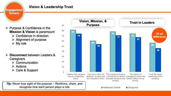 There is often a significant gap between caregivers and their leaders, impacting morale and performance. Leaders must communicate their vision clearly, demonstrate their commitment to caregivers, and involve them in the decision-making process. Creating a workplace where leaders consistently engage with their teams, showing transparency and support, can bridge the trust gap and foster a more engaged workforce.